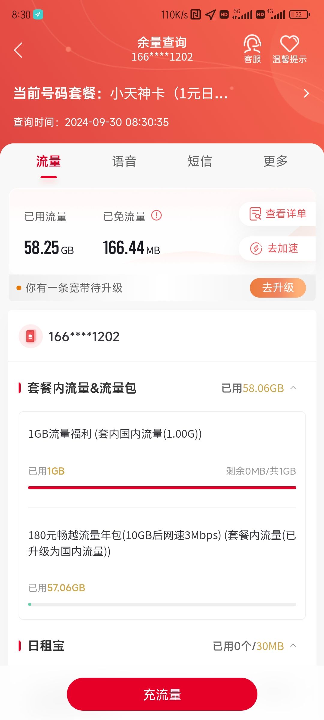 **166XXXXXXXX** 同18年左右互联网卡时期因为新出的166号段而办理,绝对的一手号码,当时办理了两个,因为实在太多号卡而注销了另外一个,如若不是后面巧合在只有半天的时间窗口期办理了180元/年10G每月高速流量剩余不限量的流量年包,或许这个号码也会被注销掉。总之因为这个套餐保留了这个号码,但前面大部分时间都闲置没怎么用。最近终于用在了4GCPE路由器上发光发热。