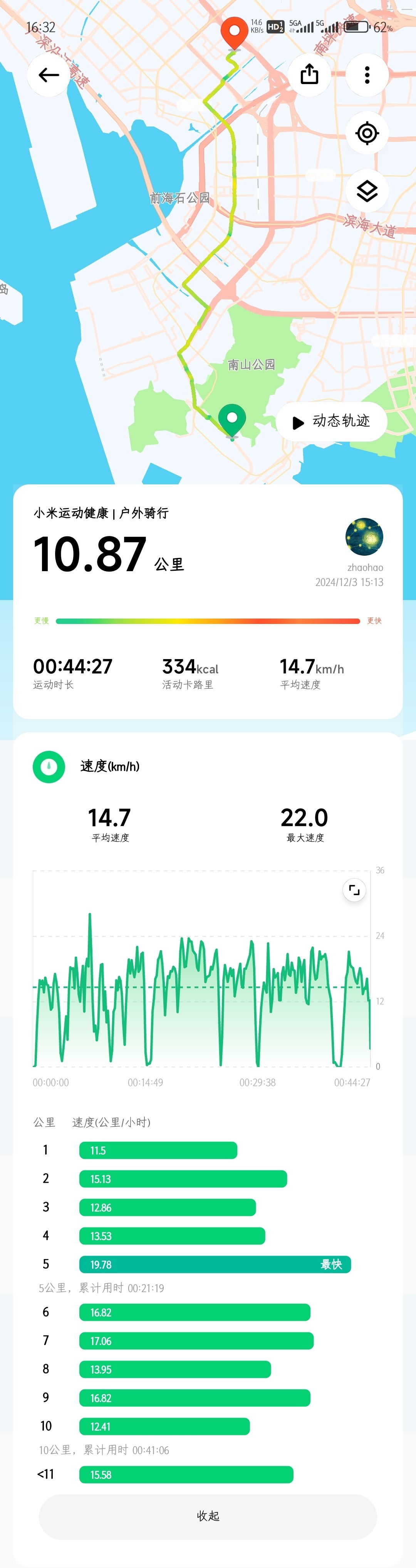 最近一段时间最快的一次了,均速18.6km/h,也算共享单车个人PB了😂。手表和手环两个平台记录的也差不多。